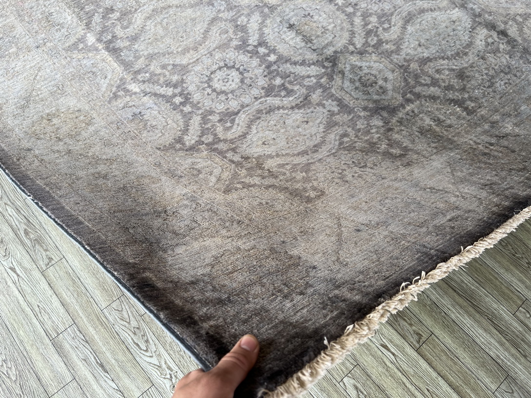 “Hand-Knotted Wool Area Rug 2.61×1.76m – Modern Distressed Carpet in Ash Gray & Beige – Subtle Medallion Pattern #50016”