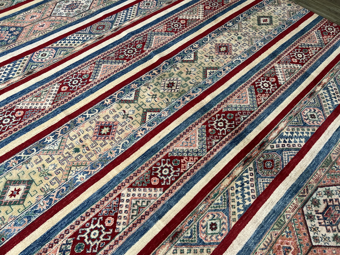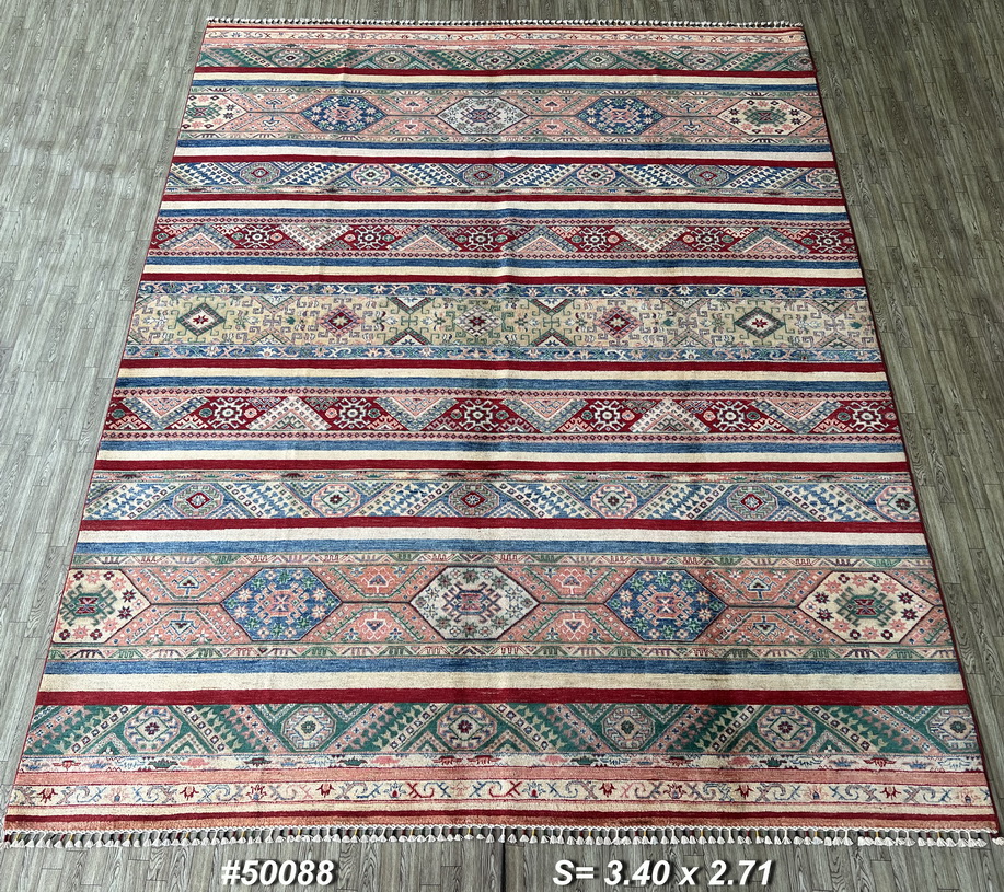 Add a bold, artistic touch to your space with this stunning hand-knotted tribal-style rug. Featuring vibrant geometric patterns arranged in colorful horizontal stripes, this rug is a perfect blend of traditional craftsmanship and modern aesthetics. Handwoven with fine wool, it offers both visual richness and exceptional durability.