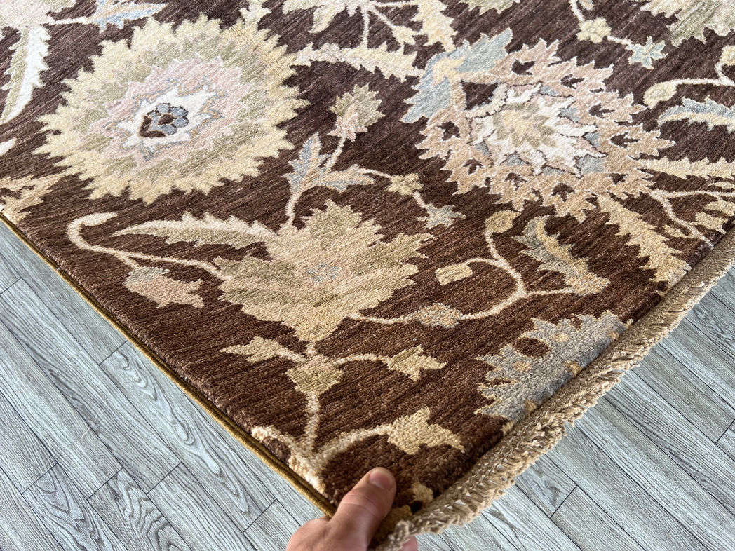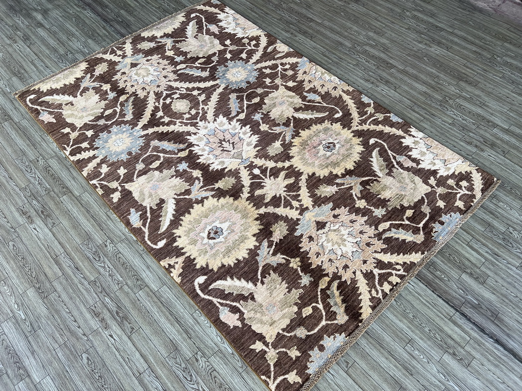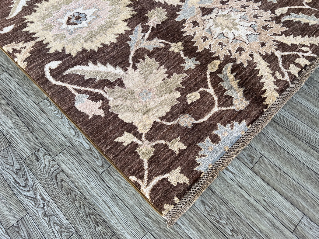 Grace your space with the warm, earthy elegance of this handwoven wool rug. Its bold chocolate brown background contrasts beautifully with soft pastel floral motifs, creating a striking visual balance that suits both traditional and modern interiors.