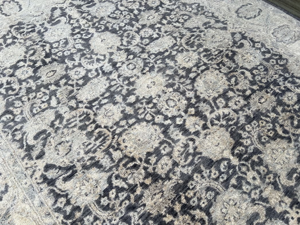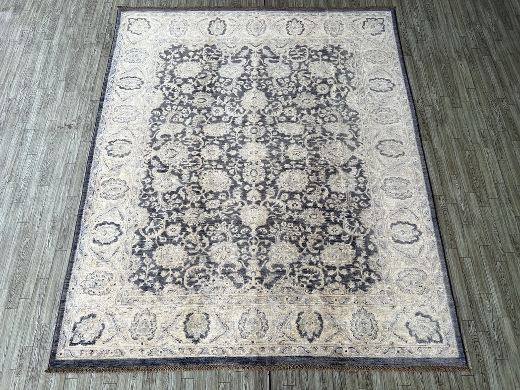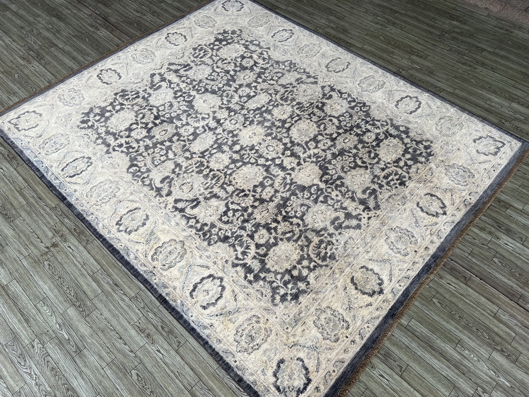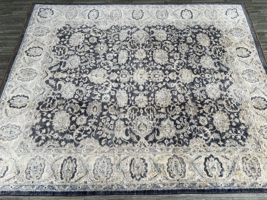 “Handwoven Vintage-Style HARIS Wool Rug โ Charcoal Black & Beige Floral Pattern โ 2.18 x 1.81 m (7.15 x 5.94 ft)”