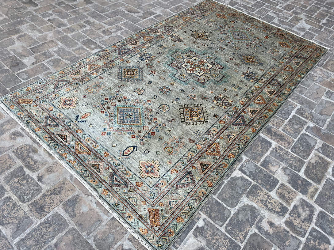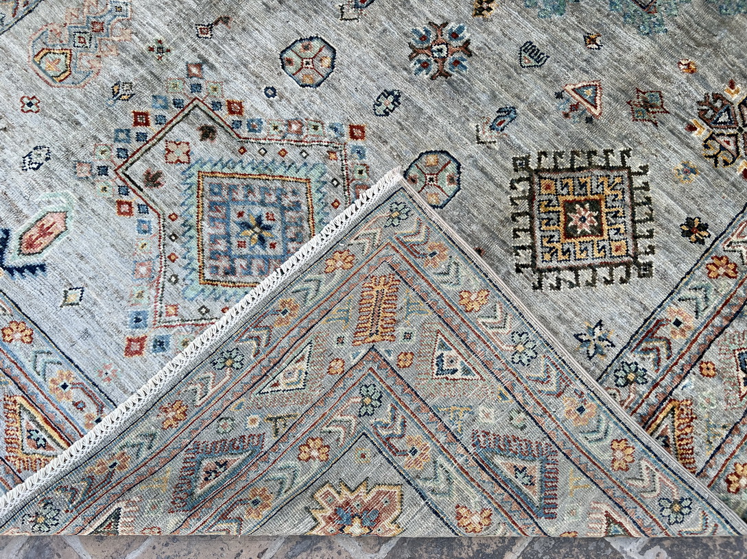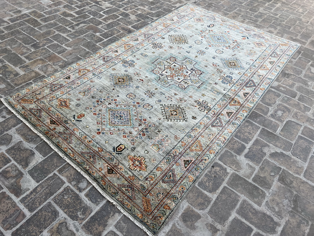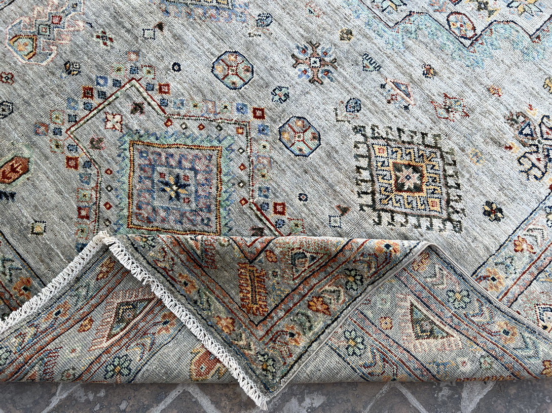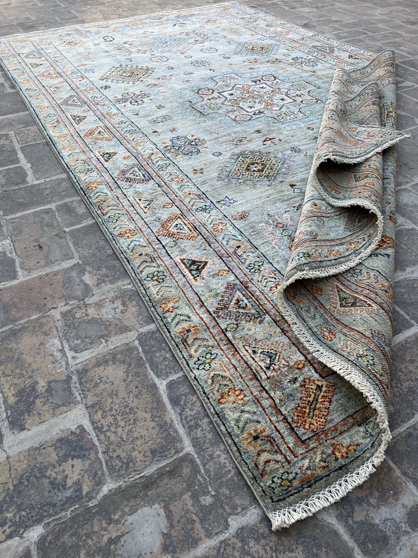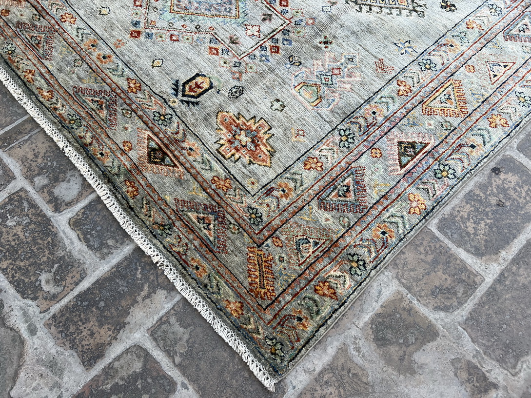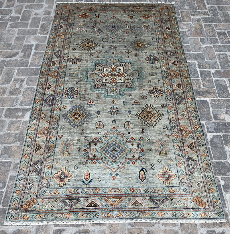 This handmade vintage-inspired rug features a soft and elegant color palette, making it a perfect addition to both traditional and modern interiors. The muted sage green background is adorned with delicate medallion motifs, geometric tribal elements, and an intricate border, giving it a timeless and sophisticated appeal. The hints of muted blue, ivory, beige, burnt orange, and subtle gold accents create a warm yet refreshing ambiance.