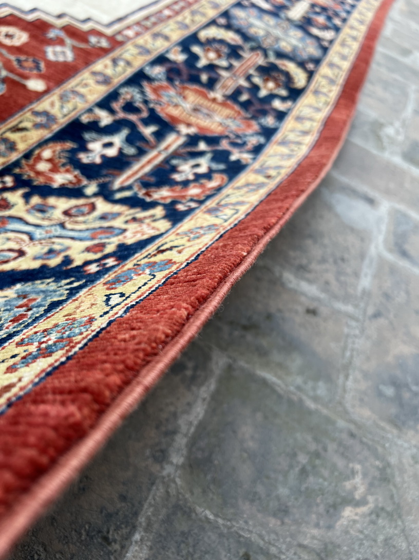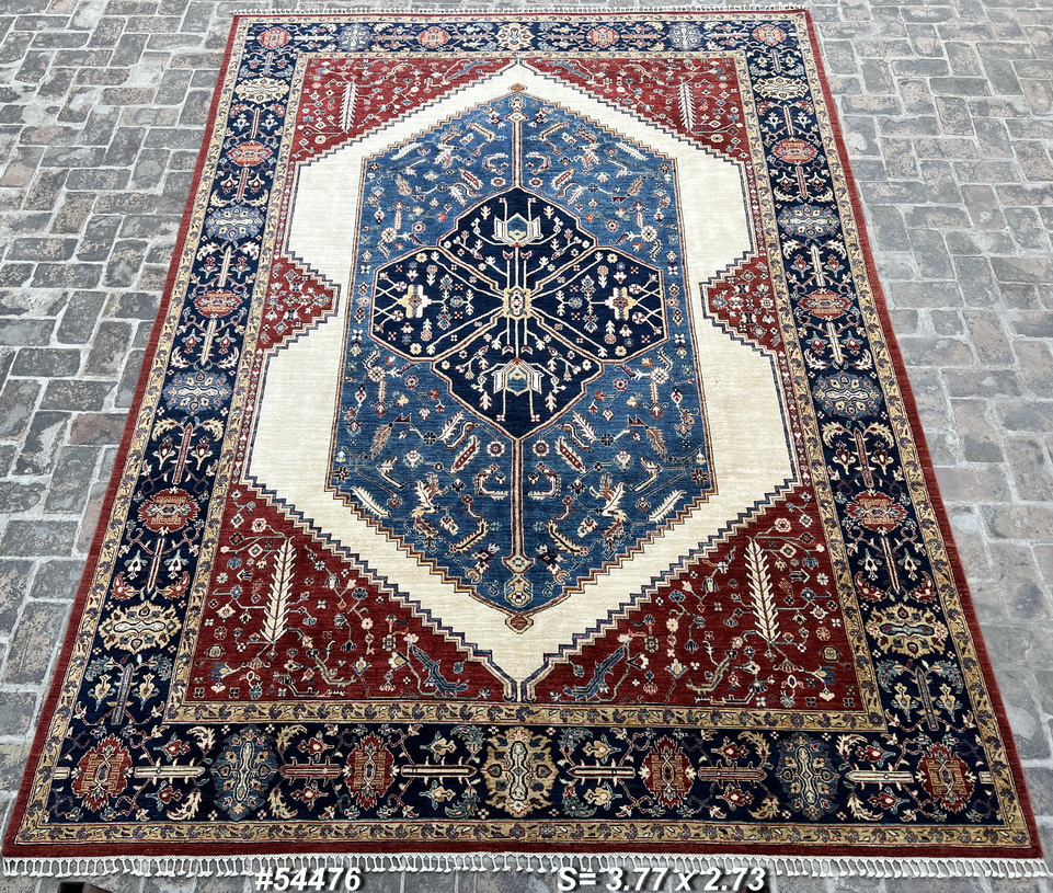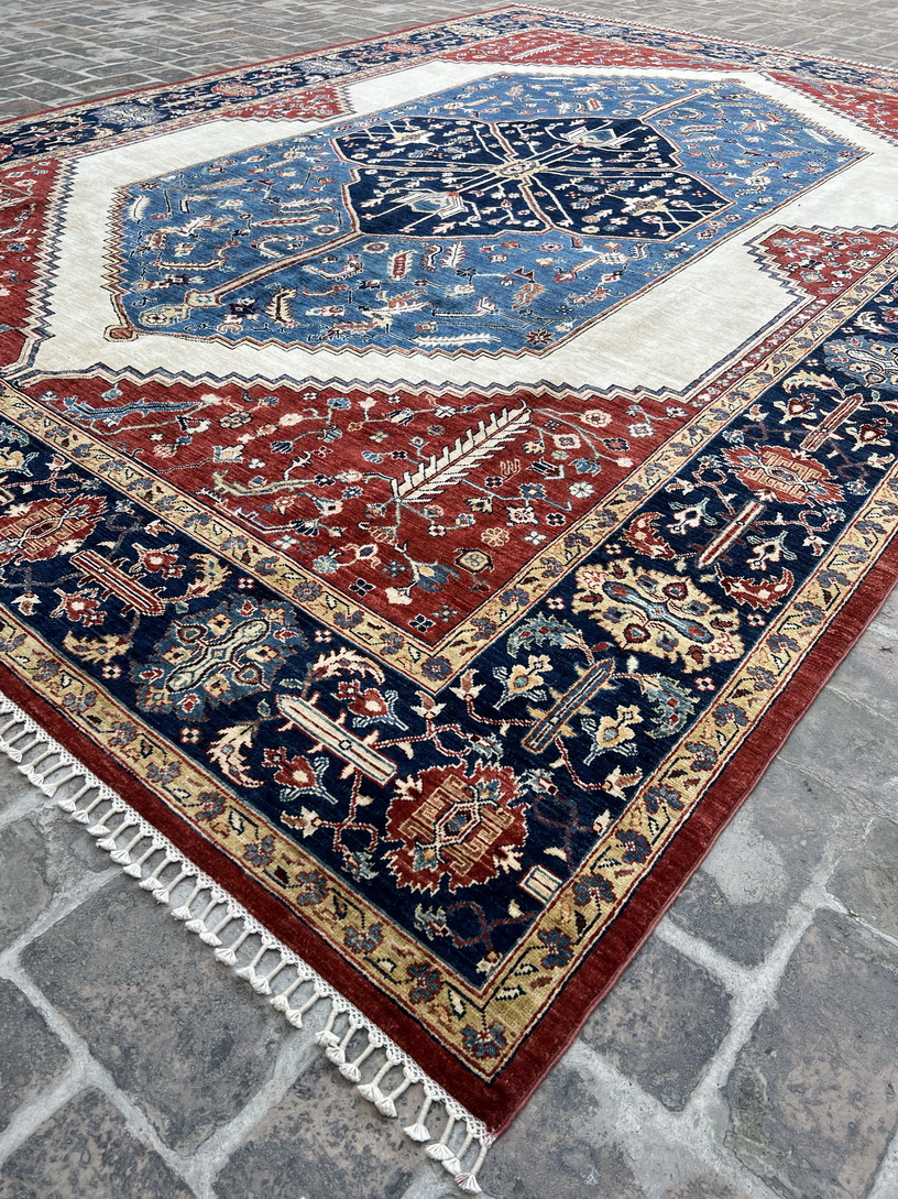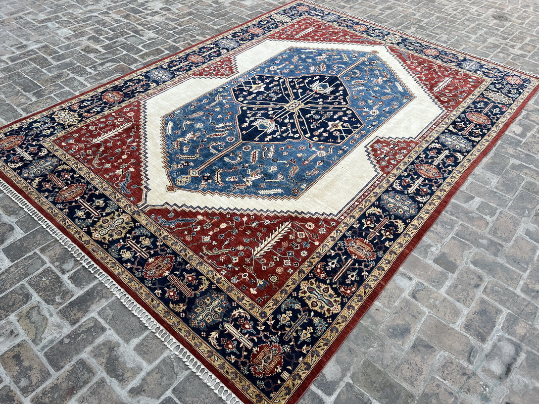 Hand-Knotted Tribal Rug – Bold Geometric Medallion & Persian Floral Design in Wool (3.77m x 2.73m)