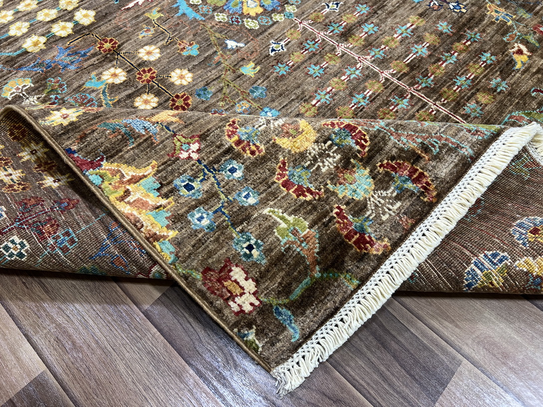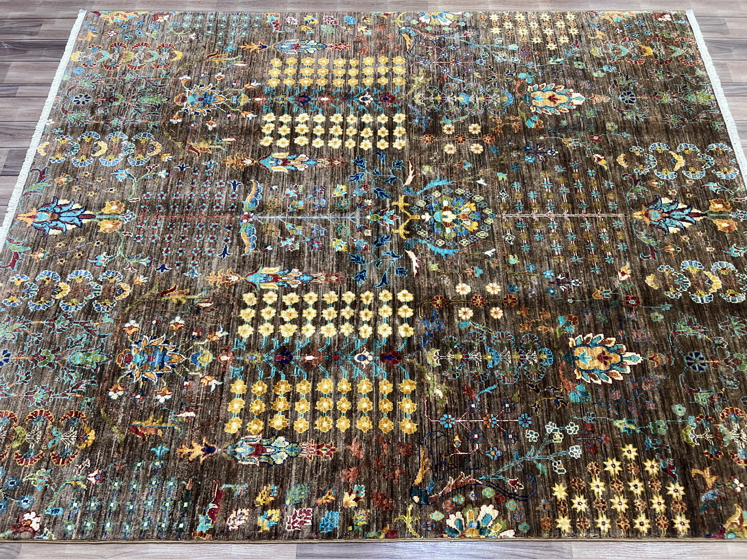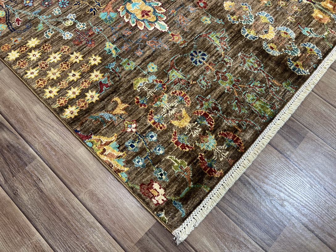 The earthy brown base sets a warm and sophisticated tone, while delicate gold, mustard yellow, and ivory highlights add a touch of elegance. Pops of aqua blue and olive green create contrast, making this rug an eye-catching addition to any interior.