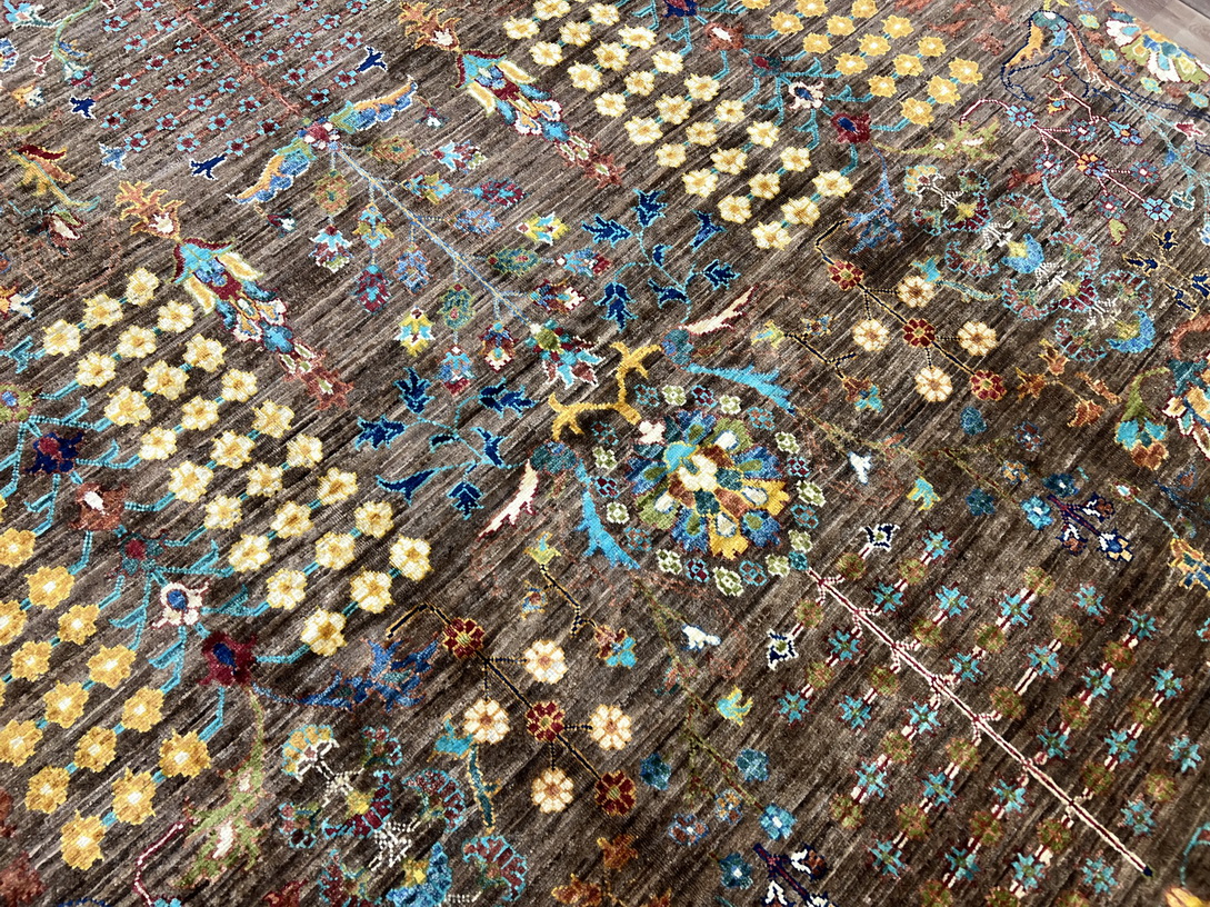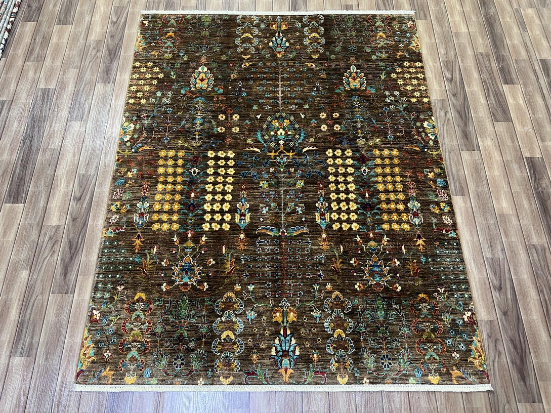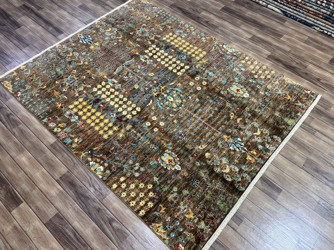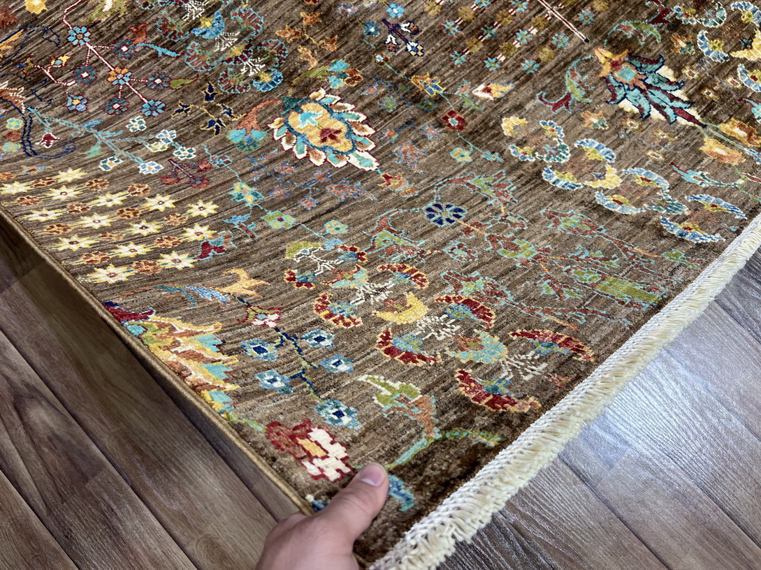 The earthy brown base sets a warm and sophisticated tone, while delicate gold, mustard yellow, and ivory highlights add a touch of elegance. Pops of aqua blue and olive green create contrast, making this rug an eye-catching addition to any interior.